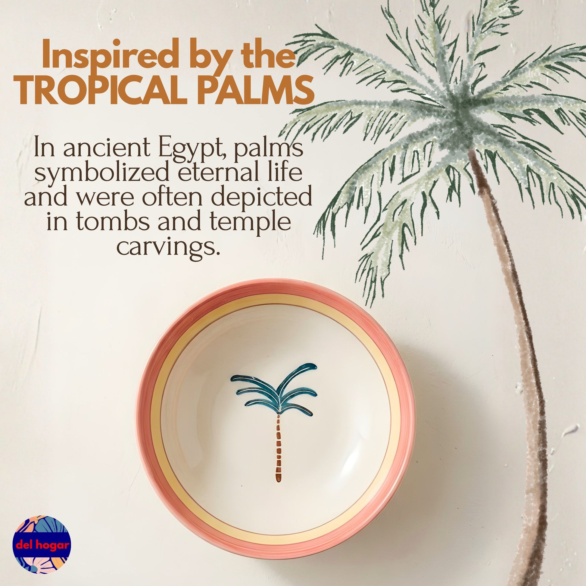 • This elegant mug+ bowl combo elevates your mealtime with its calm Mediterranean pattern of palm trees in subtle hues
