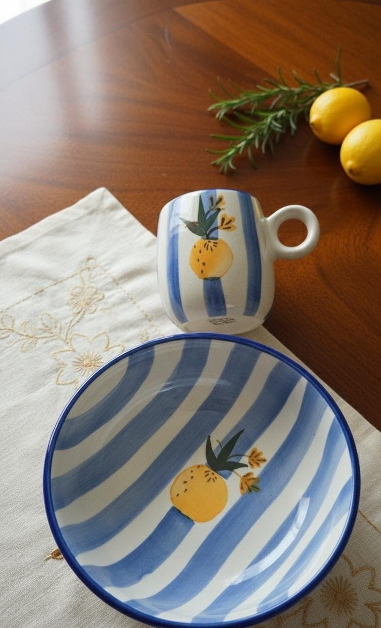 With clean blue stripes on an ivory base and a cheerful apricot painted right at the center, this bowl + Mug Duo blends simplicity with a playful twist.