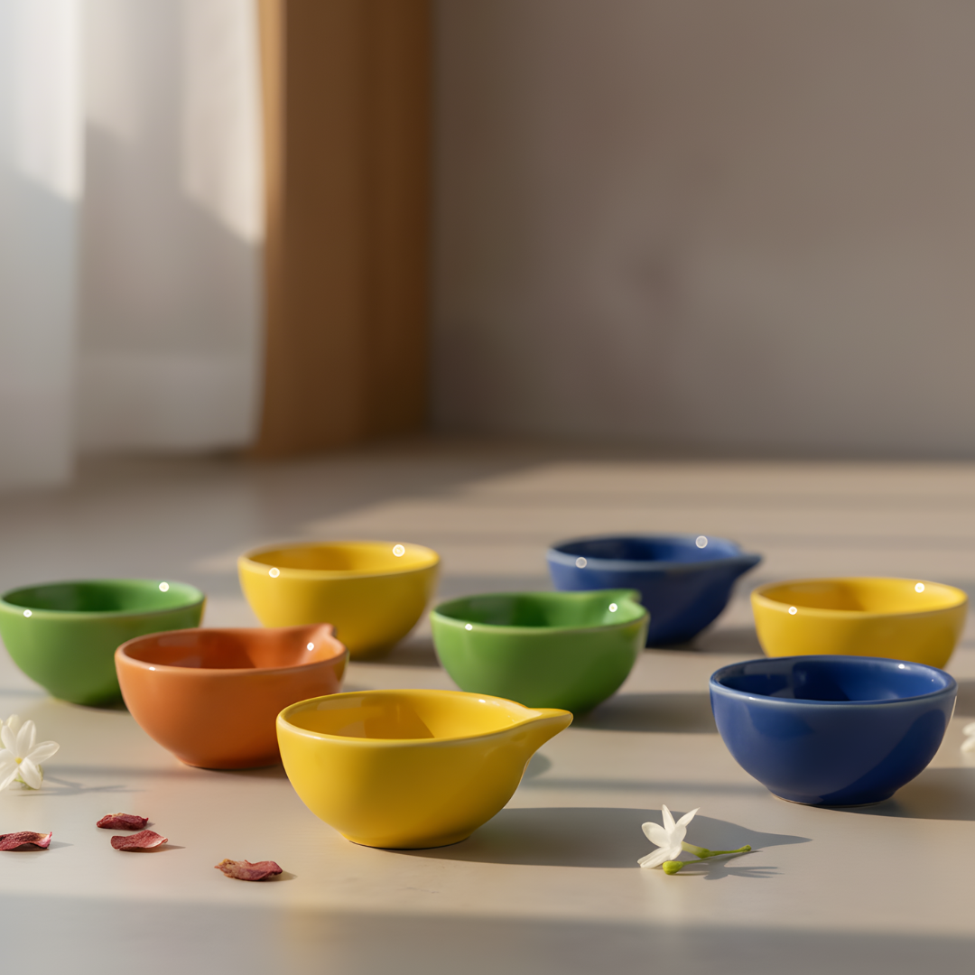 Set of Premium Glazed Ceramic diyas in multicolor- Orange , Yellow and Blue!. These come in a set of 3 diyas per pack