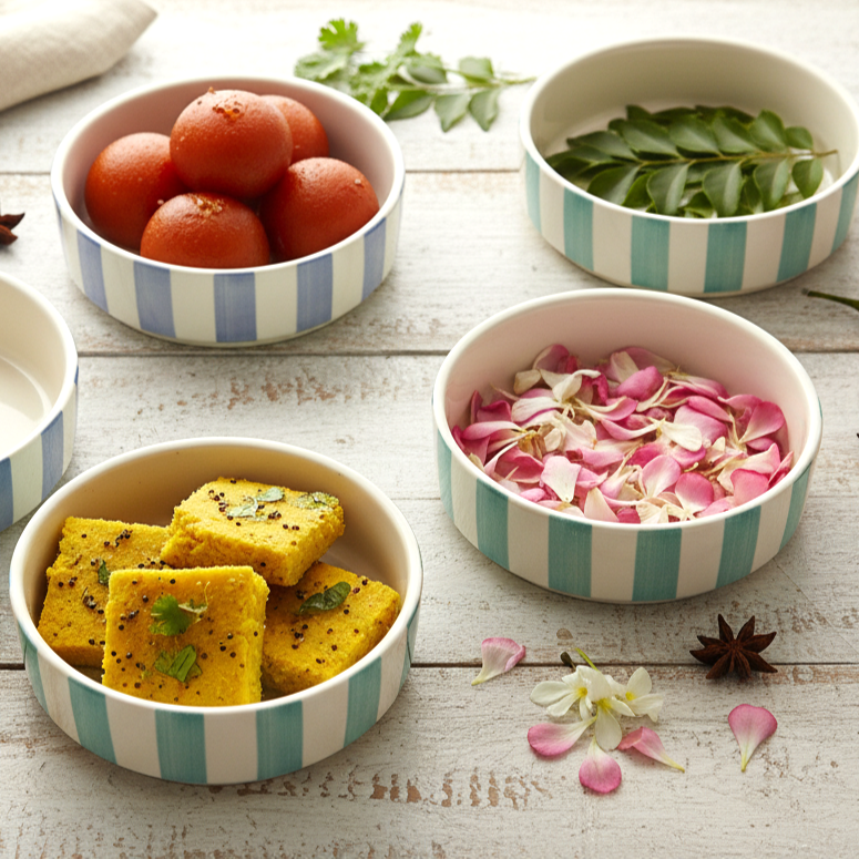 These wide ceramic bowls bring the calm of the seaside straight to your table. Crafted with an off-white base and accented with subtle sea green stripes around the rim, they offer a breezy, relaxed look perfect for everyday dining or weekend brunches.