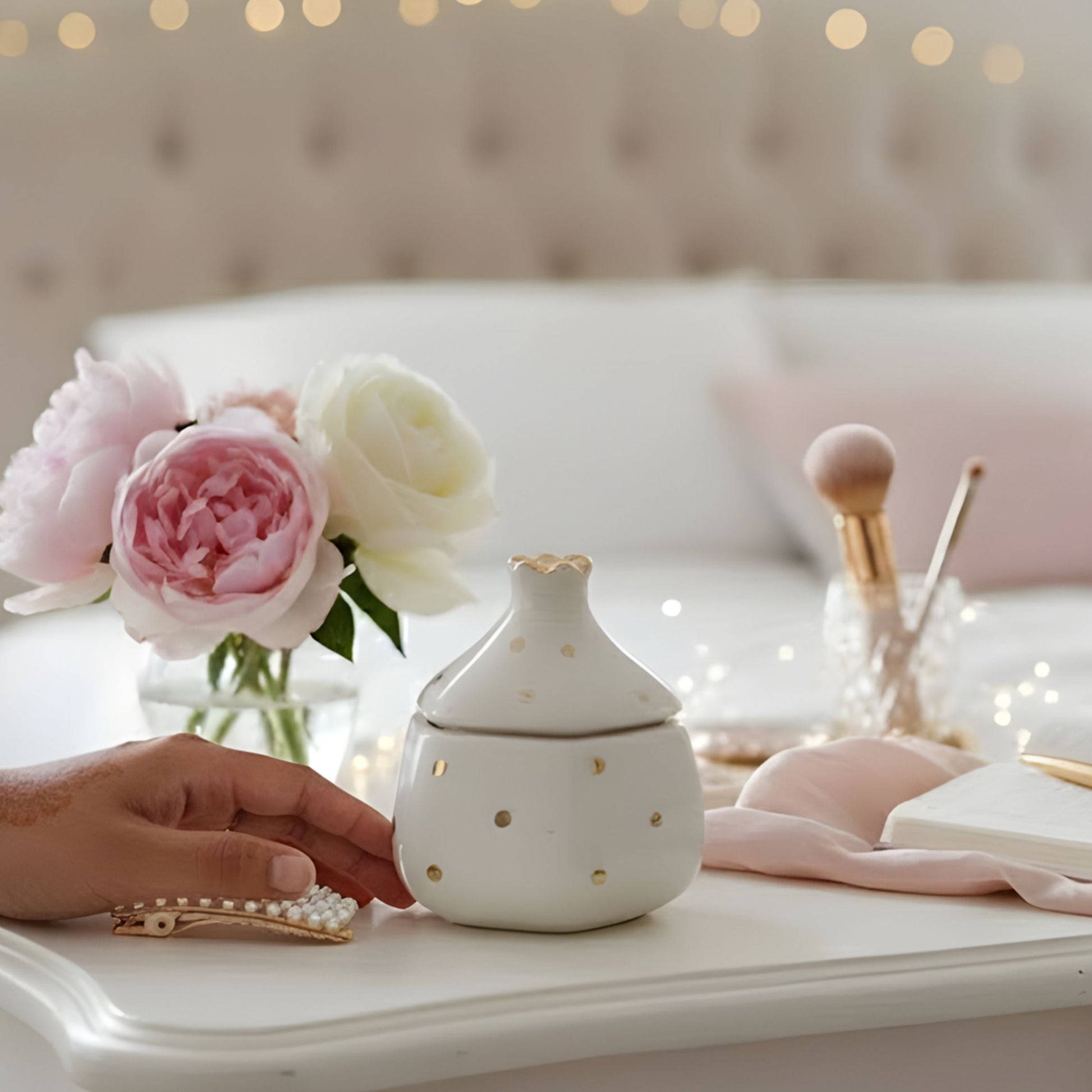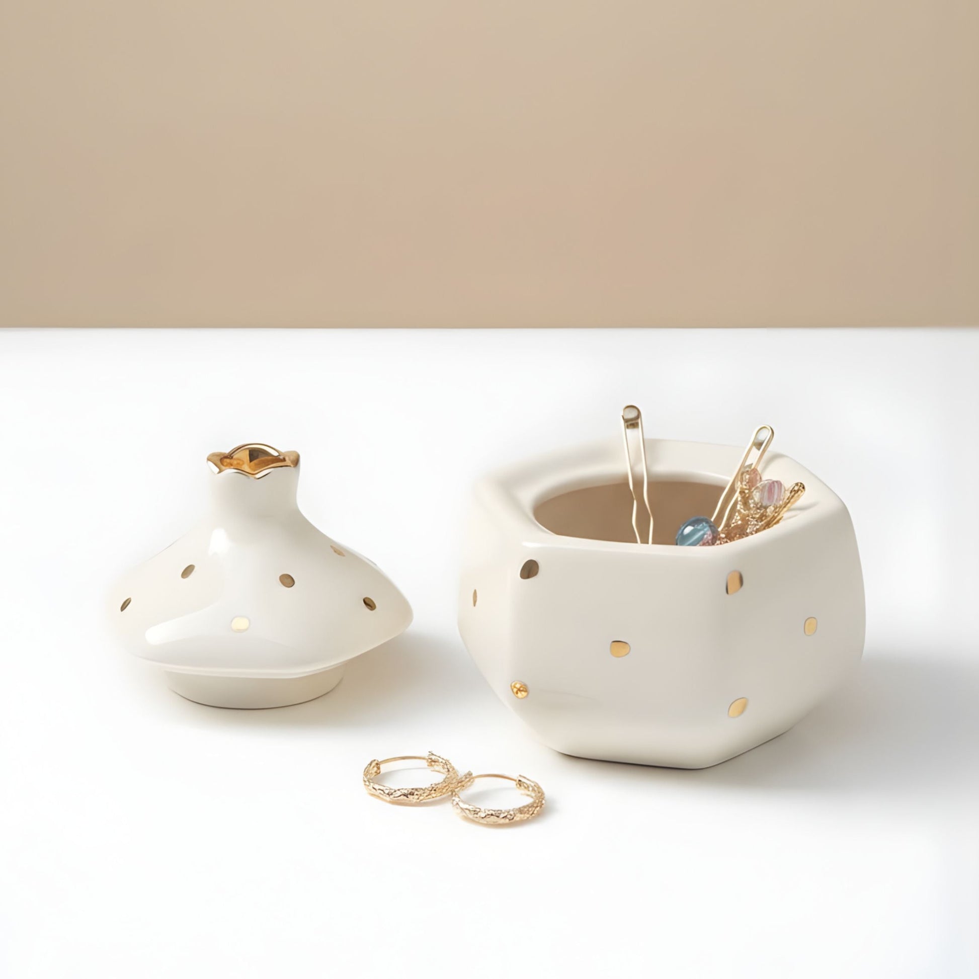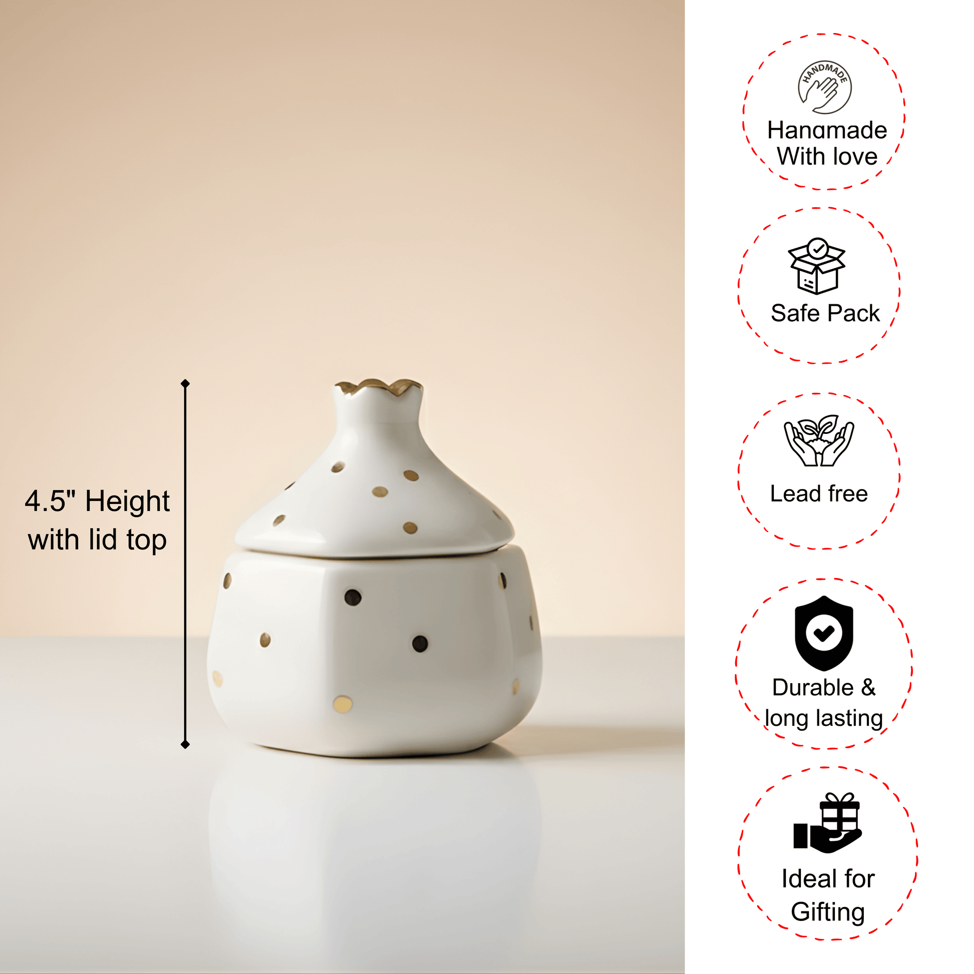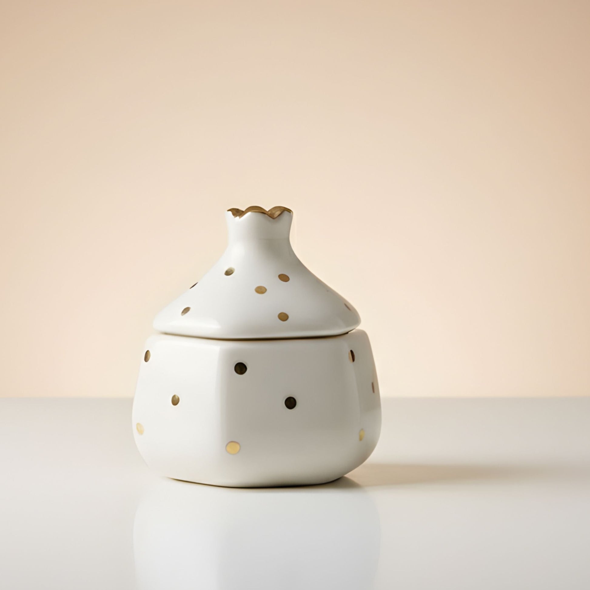 A charming, fruit-inspired trinket jar crafted in smooth glazed ceramic. Its rounded pomegranate shape, textured detailing, and glossy finish make it a beautiful accent for dressers, consoles, and vanities. Perfect for storing rings, earrings, small keepsakes, or even fragrant potpourri. Functional, playful, and decor-friendly — a cute little treasure for any corner of your home.